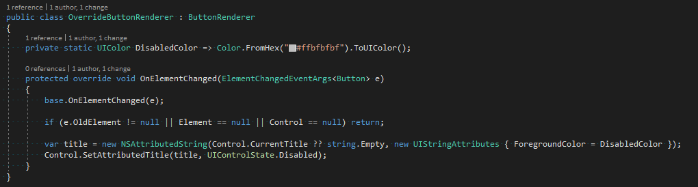 If the button is not enabled, the text should be IsEnabled=False with a red background and green foreground.